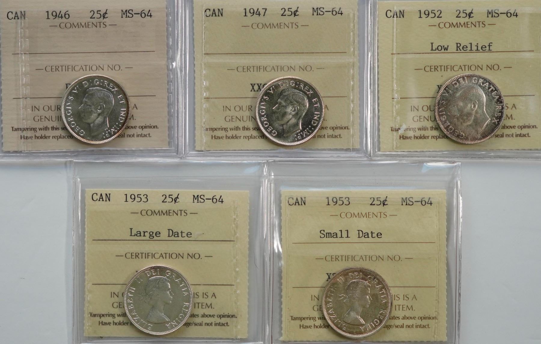 1946 25¢, 1947, 1952 LR, 1953 LD, and 1953 SD, all ICCS Choice Mint State-64, lot of 5 coins.