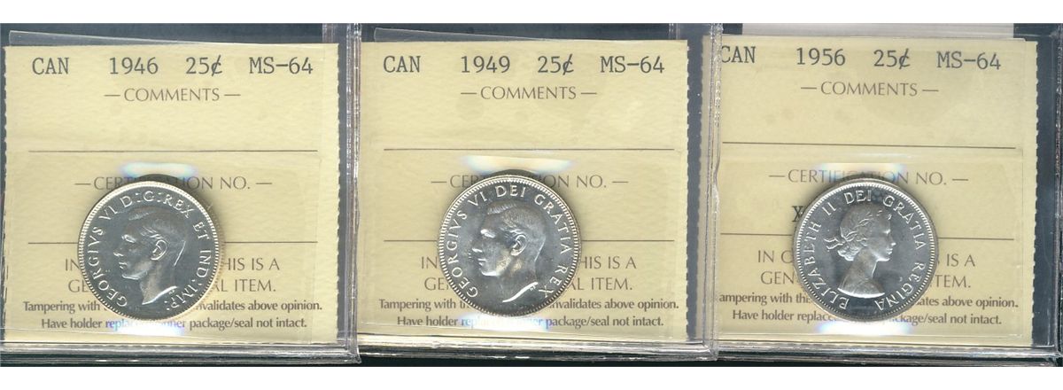 1946 25¢, 1949 & 1956 ICCS MS64. Lot of 3 coins.
