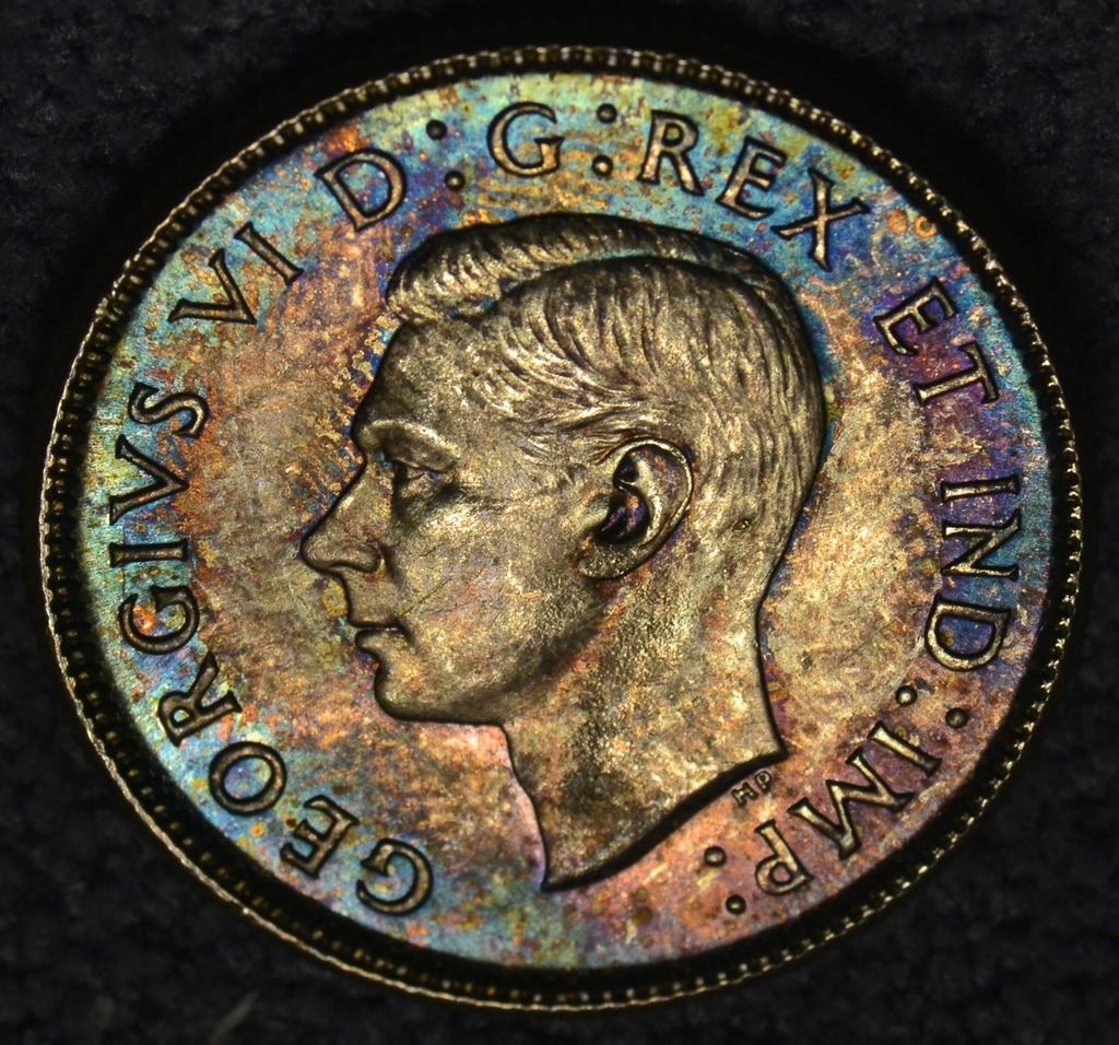 Intense greenish rainbow obv with vivid gold and orange reverse.
