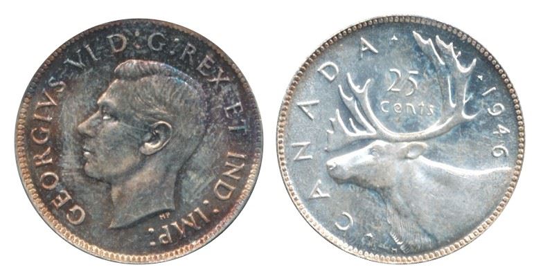 1946 25¢ ICCS/PCGS MS65. Superb lustre under reddish to blue tones.