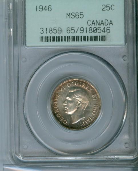 1946 25¢ PCGS MS65. Lustrous with light rim tone.