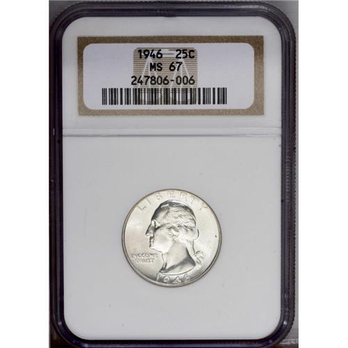 <B>1946<25C> MS67 NGC.</B></I> Dazzling luster radiates from nearly untoned surfaces that display just a wisp or two of light gold color. Minor luster grazes on Washington's jaw do not distract. Sharply struck throughout. Neither service has certified any pieces finer (1/06).