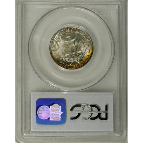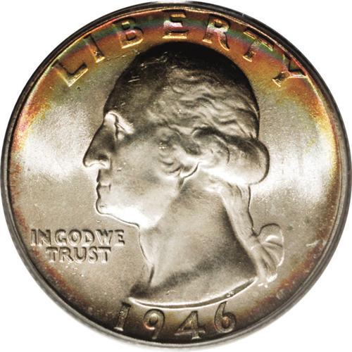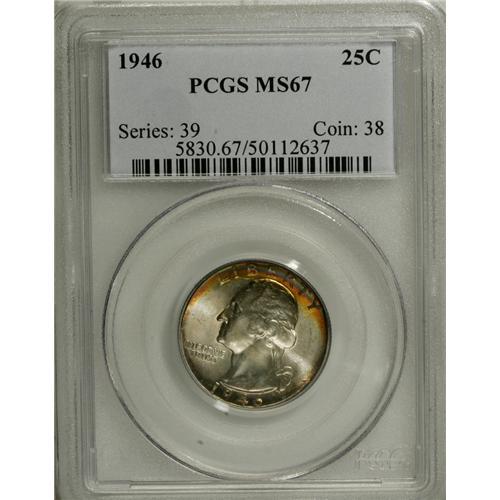 <B>1946 25C MS67 PCGS.</B></I> A colorful rainbow of toning clings to the rims on both sides, with shades of champagne, violet, and golden-olive cascading around the edges. This attractive Superb Gem has a pristine reverse and only moderate obverse contact. Population: 17 in 67, 0 finer (1/07).<BR><BR><b>Shipping:</b> Coins & Currency (<a target="_blank" href="http://www.heritageauctions.com/common/shipping.php">view shipping information</a>)