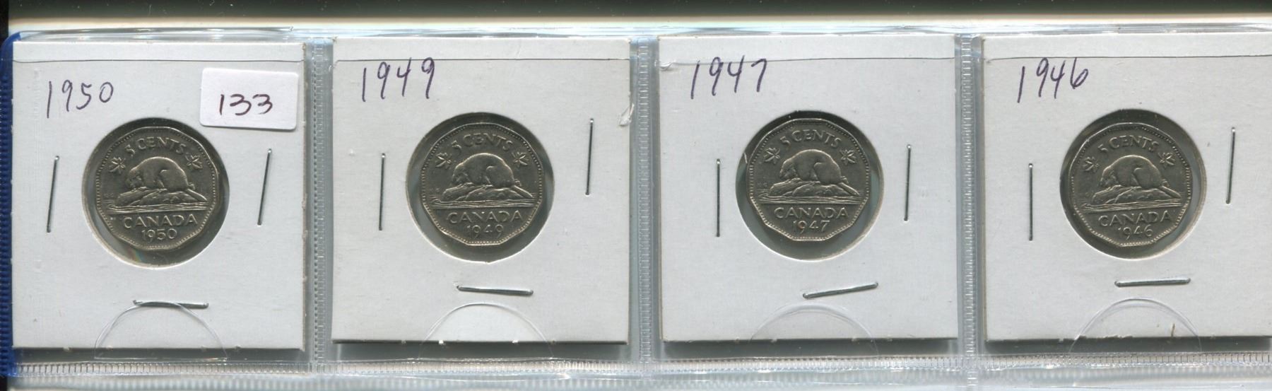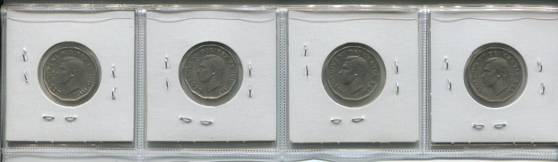 1946,47,49 & 50,4-Canadian 5 cent coins,King George VI
