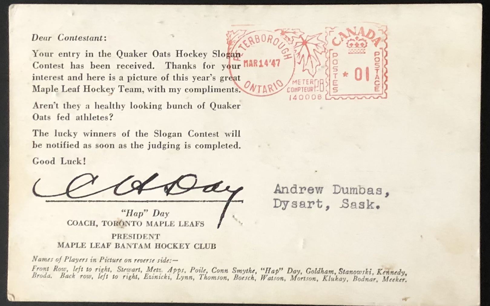 postmarked March 14, 1947 @ Peterborough, Ontario vintage, NHL, hockey, hall of fame