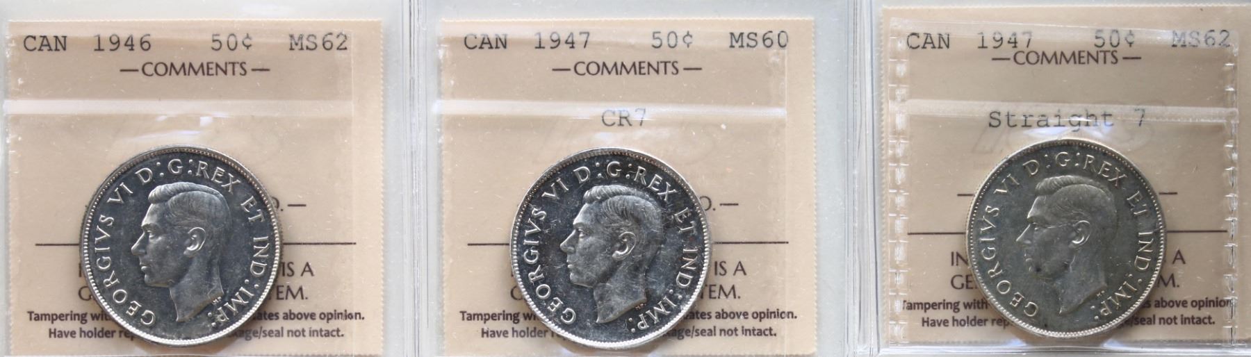 1946 50¢, 1947 "Cr7, 1947 "Straight 7". Lot of 3 coins, all ICCS Mint State-60 to Choice Mint State-62