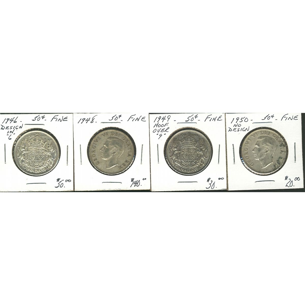1946 50¢ Des, 1948, 1949 Hoof & 1950 No Des. Lot of 4 coins all Fine. (PBA) “.