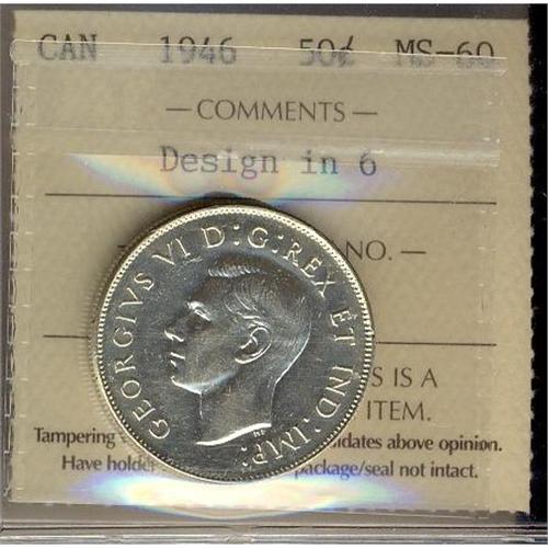 1946 50¢ Design in 6 ICCS MS60. Extremely difficult to find in MS condition.