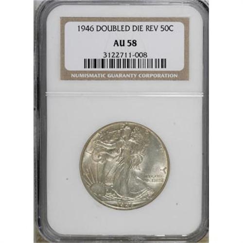 <B>1946 50C Doubled Die Reverse AU58 NGC.</B></I> NGC Census: (108/4736). PCGS Population (230/8621). Mintage: 12,118,000. Numismedia Wsl. Price for NGC/PCGS coin in AU58: $21. (#6627)<BR><BR><B>Coin Engraver:</B> Adolph A. Weinman<BR><BR><b>Shipping:</b> Coins & Currency (<a target="_blank" href="http://www.heritageauctions.com/common/shipping.php">view shipping information</a>)