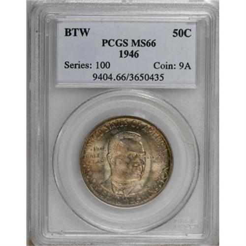<B>1946 50C Booker T. Washington MS66 PCGS.</B></I> PCGS Population (313/32). NGC Census: (373/49). Mintage: 1,000,546. Numismedia Wsl. Price for NGC/PCGS coin in MS66: $124. (#9404)<BR><BR><b>Shipping:</b> Coins & Currency (<a target="_blank" href="http://www.heritageauctions.com/common/shipping.php">view shipping information</a>)