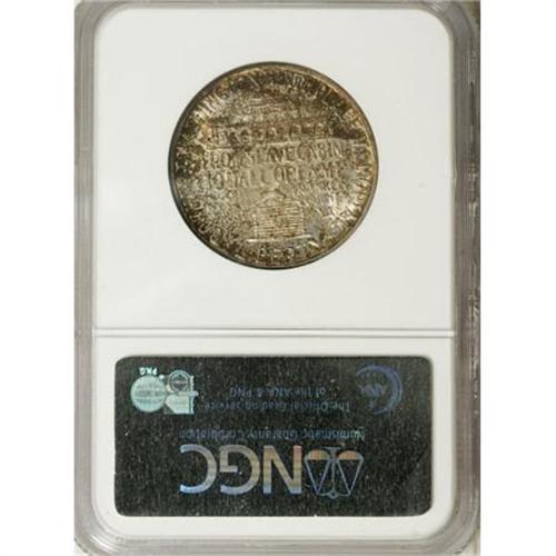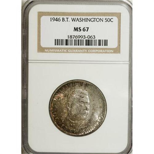 <B>1946 50C Booker T. Washington MS67 NGC.</B></I> Fire-red, sea-green, and silver-white toning embraces this satiny and suitably struck high grade example. Impressive aesthetic quality from the initial year of the type. Census: 49 in 67, 0 finer (5/07).<BR><BR><b>Shipping:</b> Coins & Currency (<a target="_blank" href="http://www.heritageauctions.com/common/shipping.php">view shipping information</a>)