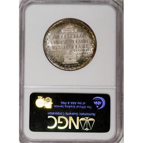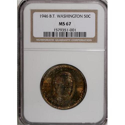 <B>1946 50C Booker T. Washington MS67 NGC.</B></I> Tied for the finest numerically at NGC (1/08). The shining obverse offers rich rose-orange and lavender patina, while a thin crescent of similar color appears at the upper margin of an otherwise brilliant reverse.<BR><BR><b>Shipping:</b> Coins & Currency (<a target="_blank" href="http://www.heritageauctions.com/common/shipping.php">view shipping information</a>)