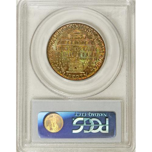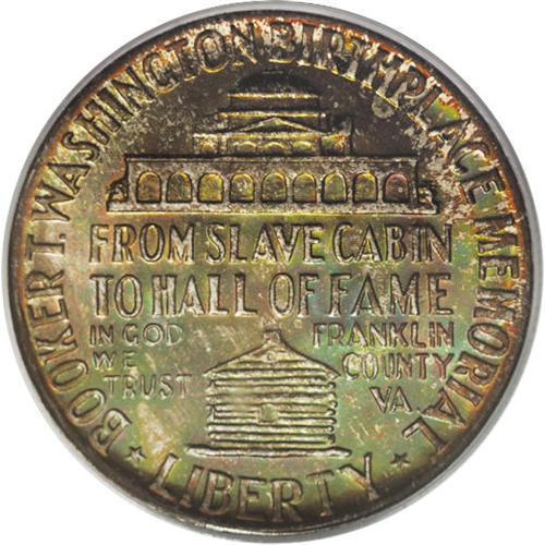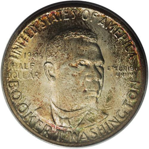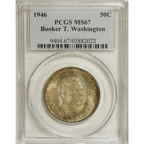 <B>1946 50C Booker T. Washington MS67 PCGS.</B></I> Artist Isaac Scott Hathaway was an instructor at the noted Tuskegee Institute, a place deeply connected to the legacy of Booker T. Washington, when the former's design appeared on the half dollars commemorating the latter. Strong luster shines beneath the gold-gray and emerald-green patina that appears on the obverse and the bronze, mint-green, and powder-blue toning evident on the reverse. PCGS has graded only one coin finer (4/07).<BR><I>From The Cary & Cheryl Porter Collection.</B></I><BR><BR><b>Shipping:</b> Coins & Currency (<a target="_blank" href="http://www.heritageauctions.com/common/shipping.php">view shipping information</a>)