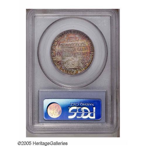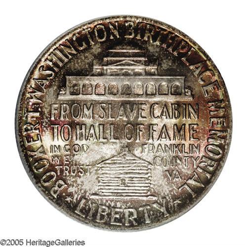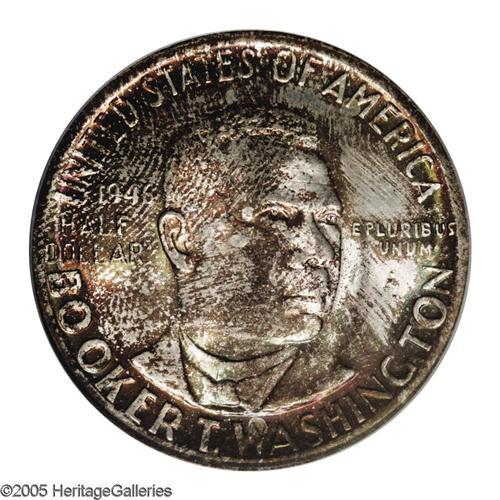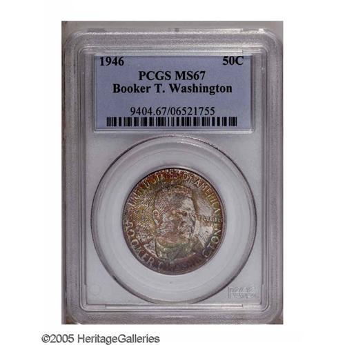 <B>1946<50C> Booker T. Washington MS67 PCGS.</B></I> Despite a large mintage, most examples were either ignored, mishandled, or spent within a short timeframe after their issuance, resulting in surprisingly low survival rates in Gem grades and higher. The present Superb Gem is thickly toned on both sides in shades of amber, lime-green, reddish-gold, and magenta. A single unobtrusive scrape through the log cabin is mentioned for accuracy. Delightful and appealing. Population: 22 in 67, 1 finer (11/05).