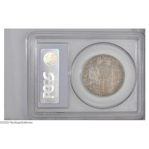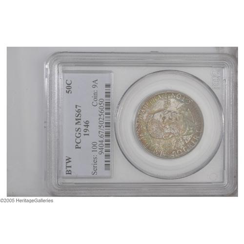 <B>1946<50C> Booker T. Washington MS67 PCGS.</B></I> Lime-green, magenta, crimson, and orange-gold patina graces this lustrous example. Following a gap of seven years and a change in presidential administrations, Commemorative halves were again issued in 1946. The new themes were the Iowa Centennial and the Booker T. Washington Memorial. 1946 Washington Halves are rarely encountered at the Superb Gem level due to indifferent strikes, but this Superb Gem has a bold strike on Washington's jaw, and the fields are nearly unmarked. Population: 23 in 67, 1 finer (9/05).