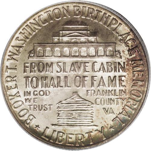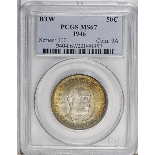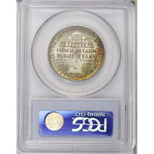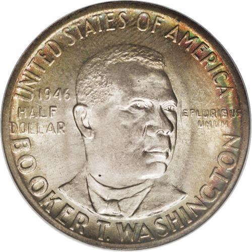 <B>1946 50C Booker T. Washington MS67 PCGS.</B></I> This may be the most attractive example of the Booker T. Washington commemorative half dollar that we have ever seen. It is also one of the finest-graded, being tied with twenty-six other coins near the top of the PCGS population report. To date, PCGS has only graded one piece at MS68, and none have achieved that lofty level at NGC (10/06). This amazing Superb Gem displays shimmering luster and beautiful, variegated toning over each side that includes elements of lime-green, gold, chartreuse, crimson, and electric-blue, among others. The piece is well struck and only a couple of thin notches on Washington's forehead and a superficial graze just to the left of E PLURIBUS prevent an even finer grade assessment.<BR><BR><b>Shipping:</b> Coin/Currency (<a target="_blank" href="http://www.heritageauctions.com/common/shipping.php">view shipping information</a>)