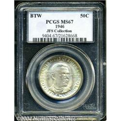 <B>1946<50C> Booker T. Washington MS67 PCGS.</B></I> Peach, forest-green, and ocean-blue colors dominate the obverse, while the reverse features vivid rose and aqua-marine patina. In addition to its splendid toning, this highly lustrous first year Superb Gem exhibits a bold strike and nearly undisturbed surfaces. Population: 19 in 67, 1 finer (6/04).<BR><I>Ex: FUN Signature Sale (Heritage, 1/02), lot 8933, which realized $1,610.</B></I><BR><I>From the JFS Collection, the #1 All-Time PCGS Registry Set.</B></I> <BR><BR><B>Important notice:</B> Heritage usually auctions material at the rate of 200-250 lots per hour. On some occasions eBay Live bid software or the Internet may not be able to keep up with the pace of the auction. We recommend placing a realistic absentee bid now as insurance to avoid disappointment. Occasionally the auctioneer may eliminate or reject an eBay Live bid, and the auctioneer may also reopen a lot after the close of the eBay live bidding (usually because we missed an audience bid), and may reject your bid even if it shows you as the winning bidder. By bidding via eBay Live, you agree that Heritage may award the lot to another bidder at its sole discretion under the circumstances described above or any other reasonable circumstances. Since eBay bids are not shown to us until we open the lot on the floor, we treat those bids just like floor bids. In most cases the floor responds before the eBay bid is presented to us, due to Internet lag time, so for consistency we have made it a policy that floor bids are always considered first over tie eBay live bids. Also please note that all Heritage lots purchased through eBay Live carry a 20% Buyer's Premium. Please make sure you read the Terms and Conditions before you bid. </span></font></tr></table></td></tr></table>