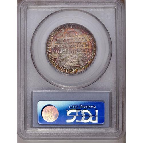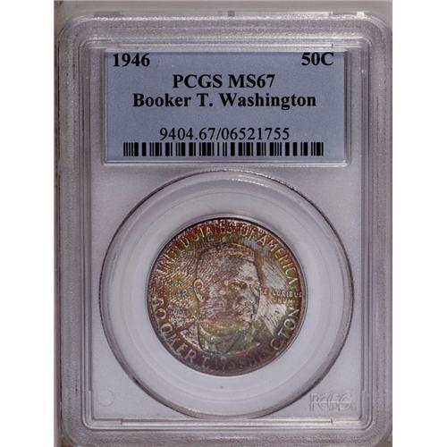 <B>1946<50C> Booker T. Washington MS67 PCGS.</B></I> Despite a large mintage, most examples were either ignored, mishandled, or spent within a short time frame after their issuance, resulting in surprisingly low survival rates in Gem grades and higher. The present Superb Gem is thickly toned on both sides in shades of amber, lime-green, reddish-gold, and magenta. A single unobtrusive scrape through the log cabin is mentioned for accuracy. Delightful and appealing. Population: 24 in 67, 1 finer (3/06).