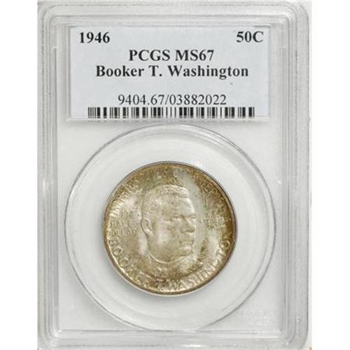 <B>1946 50C Booker T. Washington MS67 PCGS.</B></I> Strong luster shines beneath the gold-gray and emerald-green patina that appears on the obverse and the bronze, mint-green, and powder-blue toning evident on the reverse. This first-year Booker T. Washington issue is challenging in MS67 and practically impossible to find any better; PCGS has graded only one coin finer (10/07).<BR><BR><b>Shipping:</b> Coins & Currency (<a target="_blank" href="http://www.heritageauctions.com/common/shipping.php">view shipping information</a>)