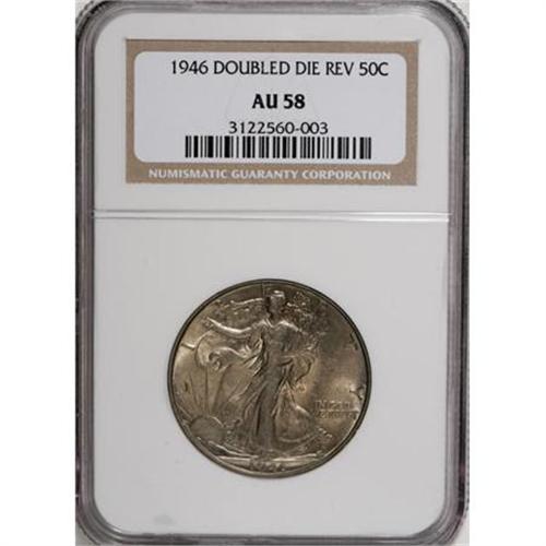 <B>1946 50C Doubled Die Reverse AU58 NGC.</B></I> FS-001. E PLURIBUS UNUM is die doubled. NGC Census: (0/0). PCGS Population (16/68). (#6632)<BR><BR><B>Coin Engraver:</B> Adolph A. Weinman<BR><BR><b>Shipping:</b> Coins & Currency (<a target="_blank" href="http://www.heritageauctions.com/common/shipping.php">view shipping information</a>)