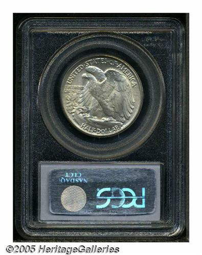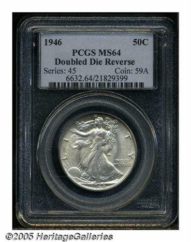 <B>1946<50C> Doubled Die Reverse MS64 PCGS.</B></I> FS-011. This example is strongly doubled in the lowest wing feathers. Whispers of light tan color visit lustrous surfaces that exhibit adequately struck devices. Minute contact marks on Liberty's lower left leg, in the right (facing) obverse field, and on the eagle's left leg define the grade. Population: 22 in 64, 10 finer (5/05).