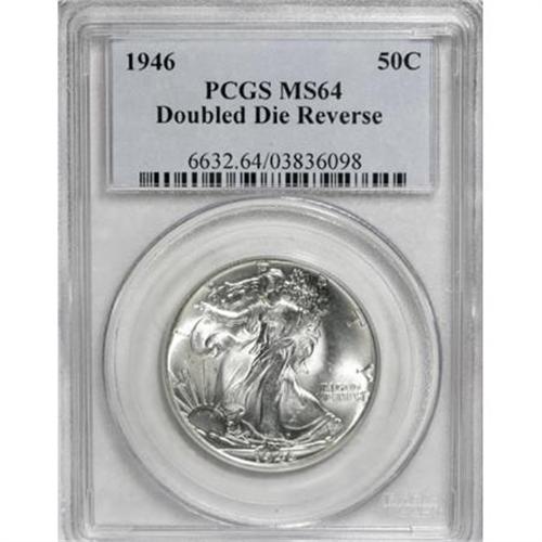 <B>1946 50C Doubled Die Reverse MS64 PCGS.</B></I> FS-801, formerly FS-011.1. Strong doubling is visible on the eagle's feathers and E PLURIBUS UNUM. Vibrant luster adorns each side of this well struck and untoned half. A scattering of light marks accounts for the grade. Population: 31 in 64 with a Doubled Die Reverse, 13 finer (1/08).<BR><BR><B>Coin Engraver:</B> Adolph A. Weinman<BR><BR><b>Shipping:</b> Coins & Currency (<a target="_blank" href="http://www.heritageauctions.com/common/shipping.php">view shipping information</a>)