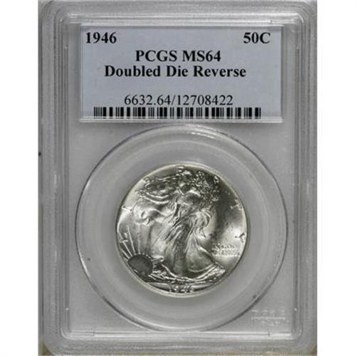 <B>1946 50C Doubled Die Reverse MS64 PCGS.</B></I> FS-801, formerly FS-011.1. A prominent doubled die variety that received a boost in popularity after appearing in the <I>Guide Book</B></I>. A strongly lustrous near-Gem survivor, minimally toned and highly appealing. Population: 33 in 64, 13 finer (3/08).<BR><BR><B>Coin Engraver:</B> Adolph A. Weinman<BR><BR><b>Shipping:</b> Coins & Currency (<a target="_blank" href="http://www.heritageauctions.com/common/shipping.php">view shipping information</a>)