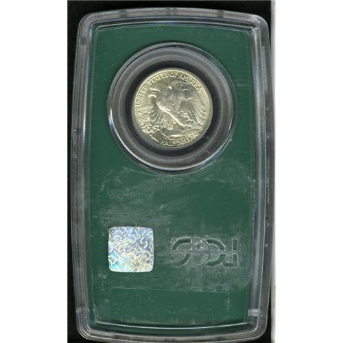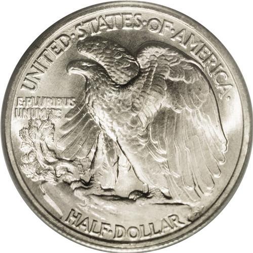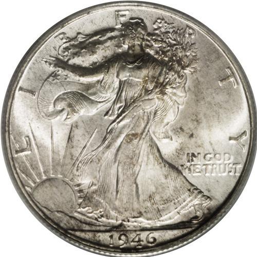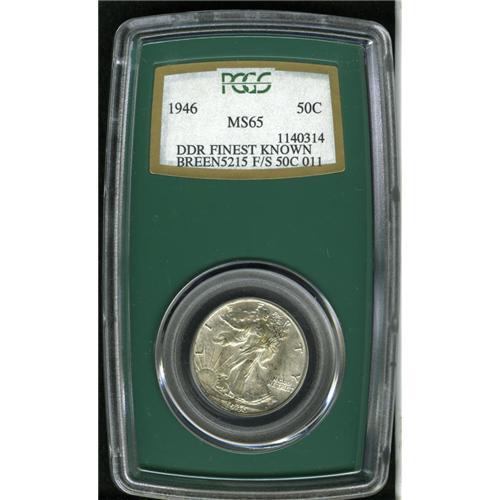 <B>1946<50C> Doubled Die Reverse MS65 PCGS.</B></I> Breen-5215, FS-011. This example is strongly doubled in the lowest wing feathers as well as E PLURIBUS UNUM.. Whispers of light tan color visit lustrous surfaces that exhibit adequately struck devices. Minute contact marks on Liberty's lower left leg and on the eagle's left leg define the grade. Housed in a now obsolete PCGS Regency (oversized) green holder.