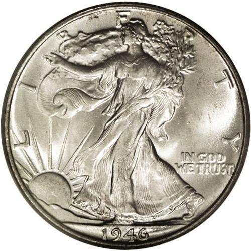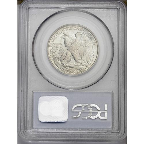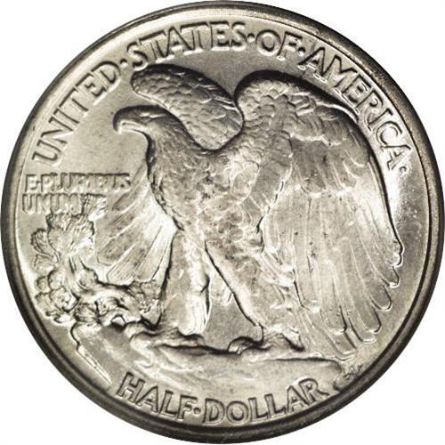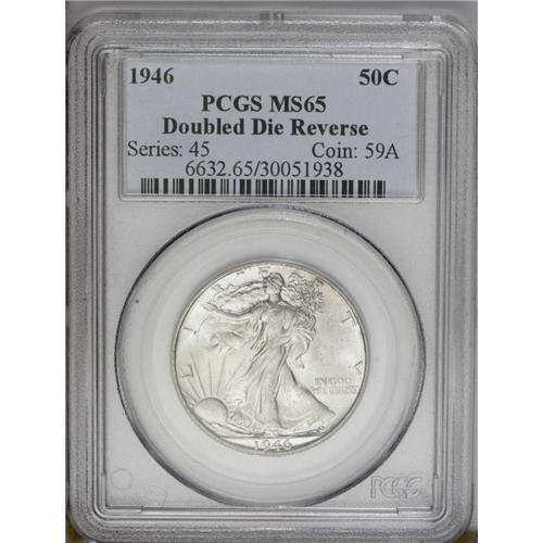 <B>1946<50C> Doubled Die Reverse MS65 PCGS.</B></I> FS-011. PLURIBUS and the wingtips below show the most dramatic doubling. This is a solid Gem example with attractive, frosty surfaces and just a bit a pale patina. Population: 7 in 65, 4 finer (8/06).
