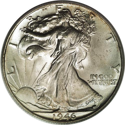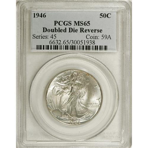 <B>1946 50C Doubled Die Reverse MS65 PCGS.</B></I> FS-801. PLURIBUS and the wingtips below show the most dramatic doubling. This is a solid Gem example with thick, frosted surfaces. Mostly brilliant, with just a bit a pale patina on the reverse. Population: 8 in 65, 4 finer (3/07).<BR><BR><b>Shipping:</b> Coins & Currency (<a target="_blank" href="http://www.heritageauctions.com/common/shipping.php">view shipping information</a>)