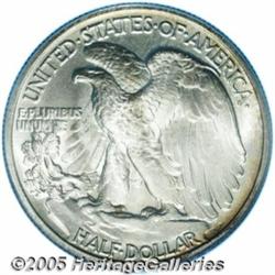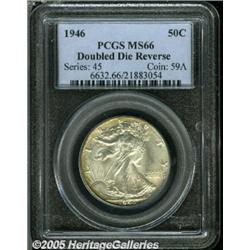 <B>1946 50C Doubled Die Reverse MS66 PCGS.</B></I> PLURIBUS and the wingtips are strongly die doubled on this lustrous and attractively preserved Gem. Lightly toned with occasional wisps of reddish-gold peripheral color. Not fully struck, although the skirt lines are virtually complete. A scarce variety in all grades, Uncirculated examples are clustered in MS63 and MS64 grades and full Gems are highly desirable. Population: 3 in 66, 0 finer (1/05).