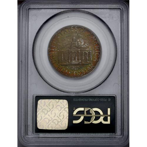 <B>1946<50C> Iowa MS65 PCGS.</B></I> A mix of medium intensity gold-orange, crimson, lime-green, and lavender toning bathes lustrous surfaces that are devoid of significant marks. The design features are well brought up. <BR><BR><B>Important notice:</B> Heritage usually auctions material at the rate of 200-250 lots per hour. On some occasions eBay Live bid software or the Internet may not be able to keep up with the pace of the auction. We recommend placing a realistic absentee bid now as insurance to avoid disappointment. Occasionally the auctioneer may eliminate or reject an eBay Live bid, and the auctioneer may also reopen a lot after the close of the eBay live bidding (usually because we missed an audience bid), and may reject your bid even if it shows you as the winning bidder. By bidding via eBay Live, you agree that Heritage may award the lot to another bidder at its sole discretion under the circumstances described above or any other reasonable circumstances. Since eBay bids are not shown to us until we open the lot on the floor, we treat those bids just like floor bids. In most cases the floor responds before the eBay bid is presented to us, due to Internet lag time, so for consistency we have made it a policy that floor bids are always considered first over tie eBay live bids. Also please note that all Heritage lots purchased through eBay Live carry a 20% Buyer's Premium. Please make sure you read the Terms and Conditions before you bid. This lot is being auctioned in conjunction with a live floor auction by Heritage Galleries & Auctioneers. All final auction and invoice information will be supplied by Heritage Galleries & Auctioneers, and all other information should be considered preliminary. Lot:4971 <BR><BR><B>Winning Notification and Billing:</B> After the FINAL session in this auction is complete, Heritage will send e-mail and snail mail invoices. This process normally takes several days. All final auction and invoice information will be supplied by Heritage Galleries & Auctioneers, and all other information should be considered preliminary. <BR><BR>This auction will be conducted on a live auction floor and over the Internet through eBay Live. If you choose to place an absentee bid, please take a moment to <font color='#0000ff'><u><a href='http://pages.ebay.com/liveauctions/help/before/laabsentee.html'>learn how eBay Live absentee bidding works</a></u></font><font color='#000000'>