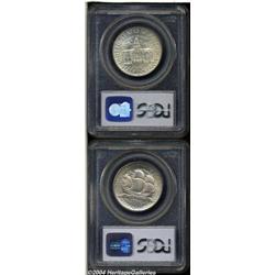 <B>1946<50C> Iowa MS65 PCGS,</B></I> lustrous and lightly toned, intricately struck, a beautiful Gem; and a <B>1936 Long Island MS65 PCGS,</B></I> potent luster, steel-blue and apricot color, not fully struck but free from distracting contact. 2 Coins <BR><BR><B>Important notice:</B> Heritage usually auctions material at the rate of 200-250 lots per hour. On some occasions eBay Live bid software or the Internet may not be able to keep up with the pace of the auction. We recommend placing a realistic absentee bid now as insurance to avoid disappointment. Occasionally the auctioneer may eliminate or reject an eBay Live bid, and the auctioneer may also reopen a lot after the close of the eBay live bidding (usually because we missed an audience bid), and may reject your bid even if it shows you as the winning bidder. By bidding via eBay Live, you agree that Heritage may award the lot to another bidder at its sole discretion under the circumstances described above or any other reasonable circumstances. Since eBay bids are not shown to us until we open the lot on the floor, we treat those bids just like floor bids. In most cases the floor responds before the eBay bid is presented to us, due to Internet lag time, so for consistency we have made it a policy that floor bids are always considered first over tie eBay live bids. Also please note that all Heritage lots purchased through eBay Live carry a 20% Buyer's Premium. Please make sure you read the Terms and Conditions before you bid. </span></font></tr></table></td></tr></table>