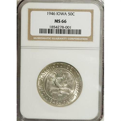 <B>1946 50C Iowa MS66 NGC.</B></I> NGC Census: (1986/616). PCGS Population (2211/679). Mintage: 100,057. Numismedia Wsl. Price for NGC/PCGS coin in MS66: $300. (#9316)<BR><BR><b>Shipping:</b> Coins & Currency (<a target="_blank" href="http://www.heritageauctions.com/common/shipping.php">view shipping information</a>\)