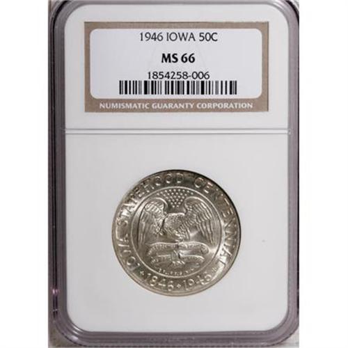 <B>1946 50C Iowa MS66 NGC.</B></I> Included with the lot is an 1893 book by Charles Eugene Banks, "The Artistic Guide to Chicago and the World's Columbian Exposition." The book is in Fine condition. NGC Census: (1986/616). PCGS Population (2211/679). Mintage: 100,057. Numismedia Wsl. Price for NGC/PCGS coin in MS66: $300. (#9316)<BR><I>From The Frank DuVall Collection of U.S. Commemoratives.</B></I><BR><BR><b>Shipping:</b> Coins & Currency (<a target="_blank" href="http://www.heritageauctions.com/common/shipping.php">view shipping information</a>\)