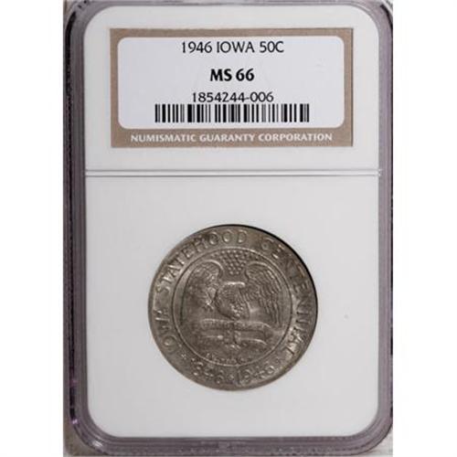 <B>1946 50C Iowa MS66 NGC.</B></I> NGC Census: (1986/616). PCGS Population (2211/679). Mintage: 100,057. Numismedia Wsl. Price for NGC/PCGS coin in MS66: $300. (#9316)<BR><I>From The Frank DuVall Collection of U.S. Commemoratives.</B></I><BR><BR><b>Shipping:</b> Coins & Currency (<a target="_blank" href="http://www.heritageauctions.com/common/shipping.php">view shipping information</a>\)