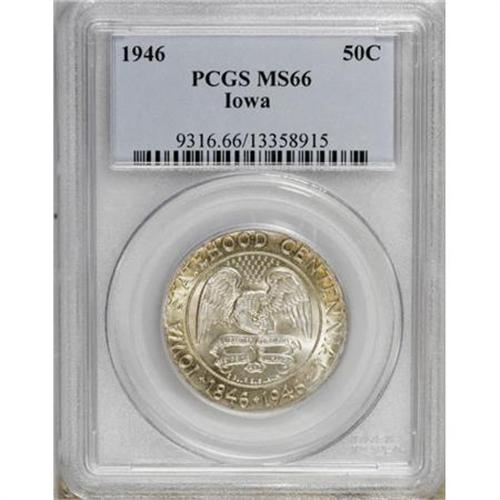 <B>1946 50C Iowa MS66 PCGS.</B></I> PCGS Population (2246/703). NGC Census: (2036/647). Mintage: 100,057. Numismedia Wsl. Price for NGC/PCGS coin in MS66: $225. (#9316)<BR><BR><b>Shipping:</b> Coins & Currency (<a target="_blank" href="http://www.heritageauctions.com/common/shipping.php">view shipping information</a>)