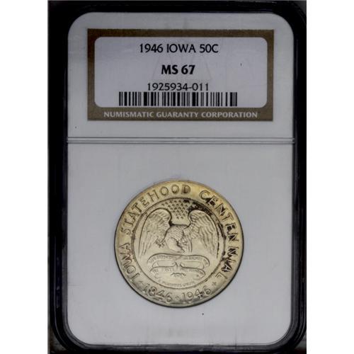 1946 50C Iowa MS67 NGC. Well struck and lustrous, with 1946[50C] Iowa MS67 NGC.