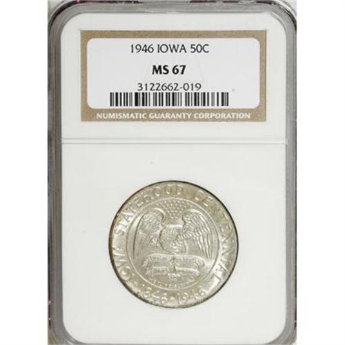 <B>1946 50C Iowa MS67 NGC.</B></I> . NGC Census: (614/35). PCGS Population (647/58). Mintage: 100,057. Numismedia Wsl. Price for NGC/PCGS coin in MS67: $340. (#9316)<BR><BR><b>Shipping:</b> Coins & Currency (<a target="_blank" href="http://www.heritageauctions.com/common/shipping.php">view shipping information</a>)