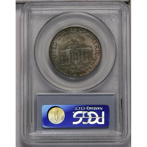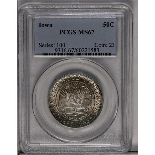 <B>1946<50C> Iowa MS67 PCGS.</B></I> Delicate ice-blue and orange-beige toning dominates. Sharply struck, with no significant marks.