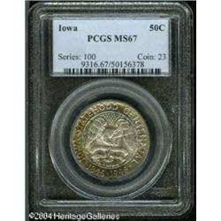 1946 50C Iowa MS67 PCGS. Lustrous surfaces are vis <B>1946 50C Iowa MS67 PCGS.</B></I> Lustrous surfaces are visited by dapples of burnt-orange and sea-green on the obverse, and violet, gold, and aqua coloration over the reverse. The intricately designed motifs are well struck. A couple of trivial marks are noted in the field above the upper right ribbon on the obverse. <BR><BR><B>Important notice:</B> Heritage usually auctions material at the rate of 200-250 lots per hour. On some occasions eBay Live bid software or the Internet may not be able to keep up with the pace of the auction. We recommend placing a realistic absentee bid now as insurance to avoid disappointment. Occasionally the auctioneer may eliminate or reject an eBay Live bid, and the auctioneer may also reopen a lot after the close of the eBay live bidding (usually because we missed an audience bid), and may reject your bid even if it shows you as the winning bidder. By bidding via eBay Live, you agree that Heritage may award the lot to another bidder at its sole discretion under the circumstances described above or any other reasonable circumstances. Since eBay bids are not shown to us until we open the lot on the floor, we treat those bids just like floor bids. In most cases the floor responds before the eBay bid is presented to us, due to Internet lag time, so for consistency we have made it a policy that floor bids are always considered first over tie eBay live bids. Also please note that all Heritage lots purchased through eBay Live carry a 20% Buyer's Premium. Please make sure you read the Terms and Conditions before you bid. This lot is being auctioned in conjunction with a live floor auction by Heritage Galleries & Auctioneers. All final auction and invoice information will be supplied by Heritage Galleries & Auctioneers, and all other information should be considered preliminary. Lot:7903
