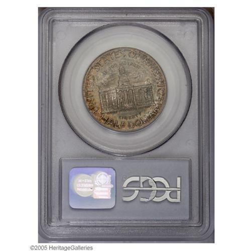 <B>1946<50C> Iowa MS67 PCGS.</B></I> The lustrous surfaces are enhanced by superbly attractive sprays of burnt-orange and sea-green on the obverse, and violet, gold, and aqua coloration over the reverse. The intricately designed motifs are well struck. A couple of trivial marks are noted in the field above the upper right ribbon on the obverse.