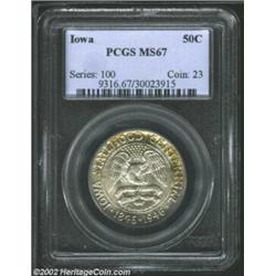 1946 50C Iowa MS67 PCGS. The otherwise silver-gray surfaces reveal a splash of olive-russet toning o