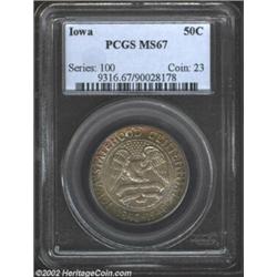1946 50C Iowa MS67 PCGS. Untoned on the reverse, the obverse is mostly lavender-gray in color with w