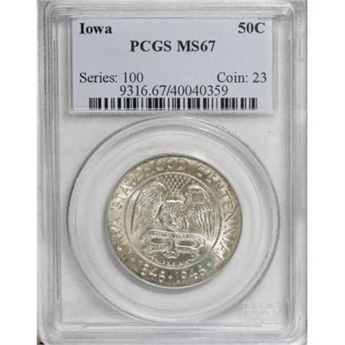 <B>1946 50C Iowa MS67 PCGS.</B></I> PCGS Population (621/58). NGC Census: (584/32). Mintage: 100,057. Numismedia Wsl. Price for NGC/PCGS coin in MS67: $464. (#9316)<BR><BR><b>Shipping:</b> Coins & Currency (<a target="_blank" href="http://www.heritageauctions.com/common/shipping.php">view shipping information</a>\)