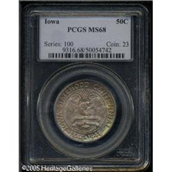 <B>1946 50C Iowa MS68 PCGS.</B></I> A nearly flawless Iowa commemorative with an overlay of pinkish-golden toning and flashes of multicolored iridescence at the margins. Population: 56 in 68, 0 finer (1/05). Lot:8510