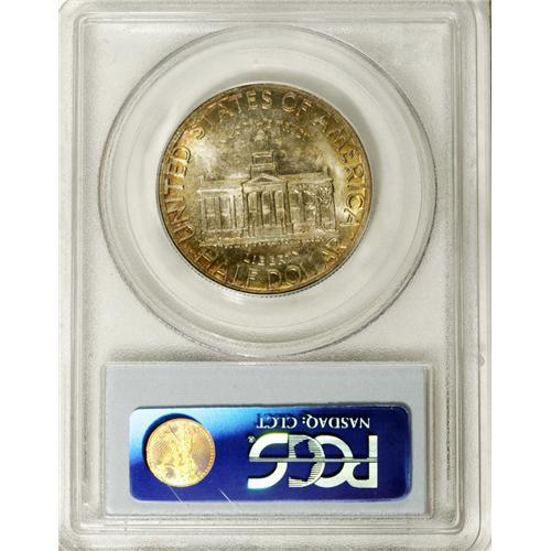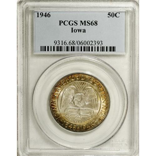 <B>1946 50C Iowa MS68 PCGS.</B></I> An amazing example that only furthers the notion that the Iowa is an issue for which high quality is the rule, not the exception. The luster is pleasing, and the detail is strong. Gold-orange and peach patina appears at the obverse periphery, while the same toning covers most of the reverse. As may be inferred from the grade, the surfaces are nearly flawless. Population: 58 in 68, 0 finer (11/06).<BR><BR><b>Shipping:</b> Coin/Currency (<a target="_blank" href="http://www.heritageauctions.com/common/shipping.php">view shipping information</a>)