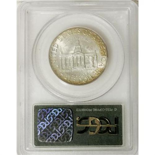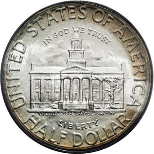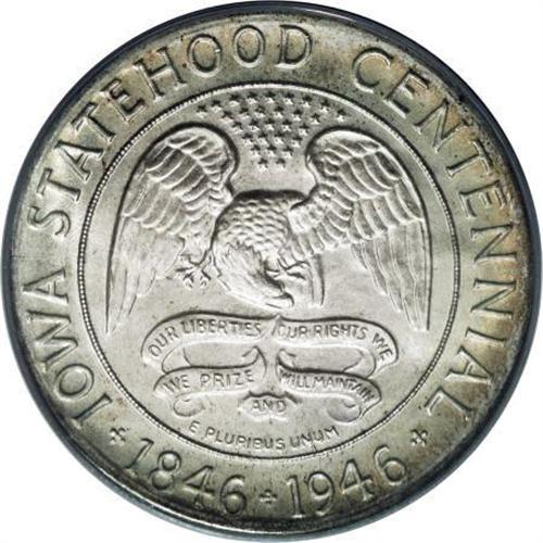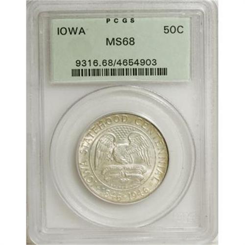 <B>1946 50C Iowa MS68 PCGS.</B></I> The 1946 Iowa half, the first non-circulating commemorative issued by the United States since the moratorium of 1939, was one of the more successful classic commemoratives. The vast majority sold, and the potential for speculative abuses approached nil. The olive-tan and silver-gray patina over the incredibly well-preserved piece offered here forms a partial tab pattern on the reverse. Strongly lustrous with excellent visual appeal. Neither NGC nor PCGS has certified a numerically finer example (9/07).<BR><I>From The Sterling Collection.</B></I><BR><BR><b>Shipping:</b> Coins & Currency (<a target="_blank" href="http://www.heritageauctions.com/common/shipping.php">view shipping information</a>)
