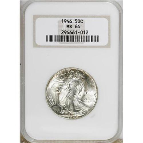 <B>1946 50C MS64 NGC.</B></I> NGC Census: (1860/2247). PCGS Population (3484/3626). Mintage: 12,118,000. Numismedia Wsl. Price for NGC/PCGS coin in MS64: $55. (#6627)<BR><BR><B>Coin Engraver:</B> Adolph A. Weinman<BR><BR><b>Shipping:</b> Coins & Currency (<a target="_blank" href="http://www.heritageauctions.com/common/shipping.php">view shipping information</a>)