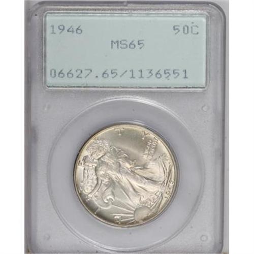 <B>1946 50C MS65 PCGS.</B></I> PCGS Population (2873/737). NGC Census: (1686/530). Mintage: 12,118,000. Numismedia Wsl. Price for NGC/PCGS coin in MS65: $204. (#6627)<BR><BR><B>Coin Engraver:</B> Adolph A. Weinman<BR><BR><b>Shipping:</b> Coins & Currency (<a target="_blank" href="http://www.heritageauctions.com/common/shipping.php">view shipping information</a>)
